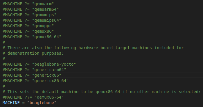 • Poky đã cho khá nhiều lựa chọn trong local.conf, ở đây mình cố định beaglebone nên mình dùng gán trực tiếp luôn