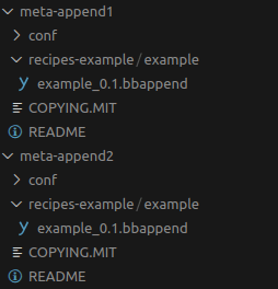 Dễ thấy trong 3 meta-layer đều có 1 recipe chung là example_0.1.bb, tuy nhiên 2 meta-append của chúng ta mục đích là append nên ta sẽ sửa đuôi của nó thành bbappend. Kết quả sẽ như sau