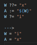 • ??= (weak default value) : Nếu biến chưa từng được set thì sẽ lấy giá trị ở đây, hành vi set giá trị biến ngay lập tức nếu biến khác tương tác. Và nó yếu hơn “?=”