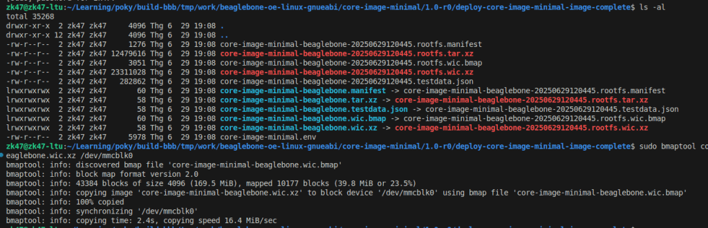 Có 1 thủ thuật nhỏ dùng (ls -al) để tránh việc copy nhầm file đó là mình luôn check thời gian build sau khi vào folder. Đôi khi do Bitbake vẫn lưu state dẫn đến việc không trigger build lại image.