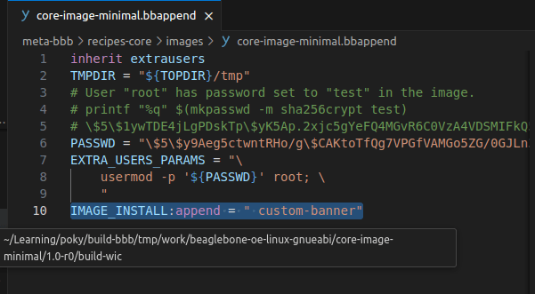- FILESEXTRAPATHS=”/home/zk47/Learning/poky/meta-bbb/recipes-core/custom-banner/custom-banner