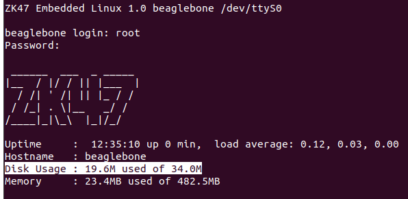 Ở đây, trên banner ta thấy 1 điều lạ. Toàn bộ Disk usage chỉ 34Mb, nhưng thẻ nhớ mình đang dùng tận 32gb, do đó có 1 cơ chế nào đó khiến RFS (Root file system đang fix-sized, không tự mở rộng)