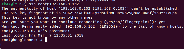 Lưu ý mỗi khi ssh sau khi build lại image, beaglebone tạo lại ssh key khi boot nên bên laptop mình cũng phải xóa key cũ tại .ssh/know_host tạo lại key mới