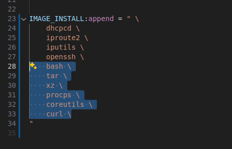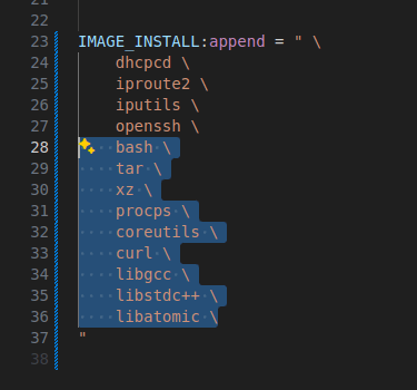 Lại phải cài thêm libgcc, libstdc++, libatomic. Sau cùng IMAGE_INSTALL:append của chúng ta sẽ là