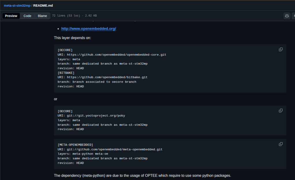 Chúng ta đọc file README từ trong repo này, ST sẽ miêu tả chúng ta cần thêm các layer nào khi build (https://github.com/STMicroelectronics/meta-st-stm32mp/blob/scarthgap/README.md)