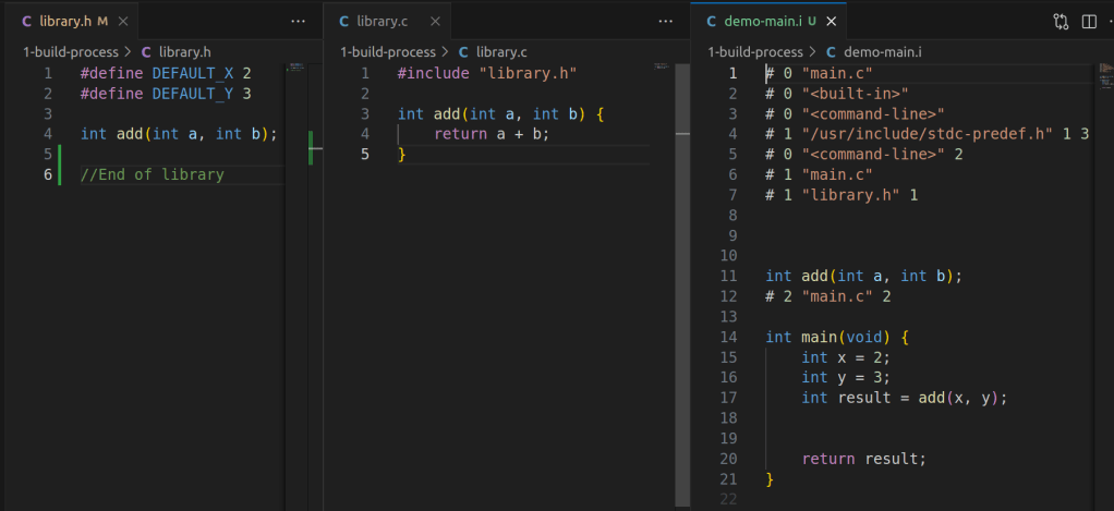 Ta đã thấy Quá trình Tiền xử lý đã xóa đi các comment, thay thế trực tiếp các vị trí dùng Macro (DEFAULT_X, DEFAULT_Y) bằng giá trị tương ứng.