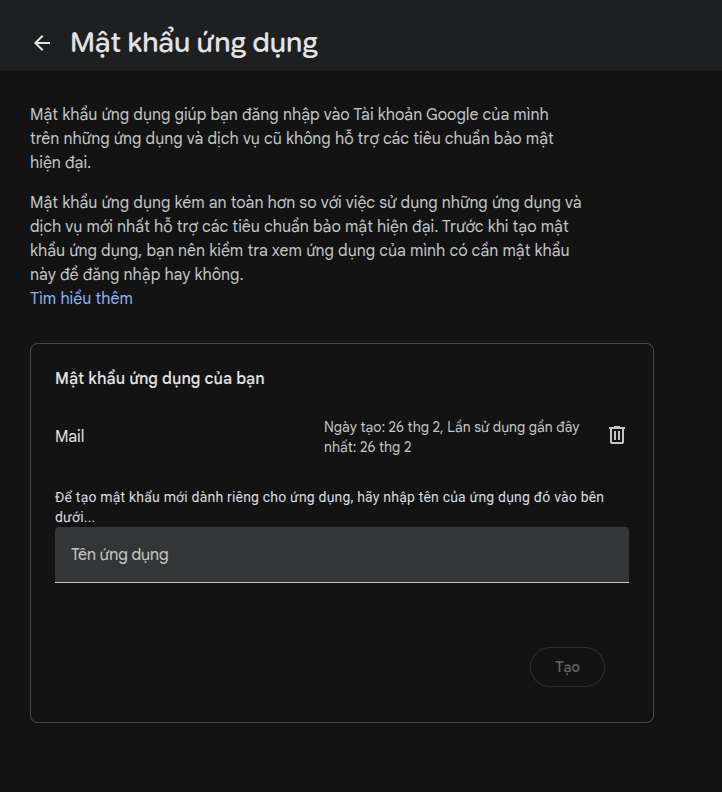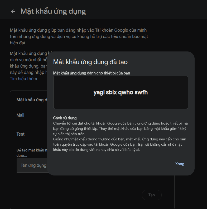 Các bạn truy cập https://myaccount.google.com/apppasswords