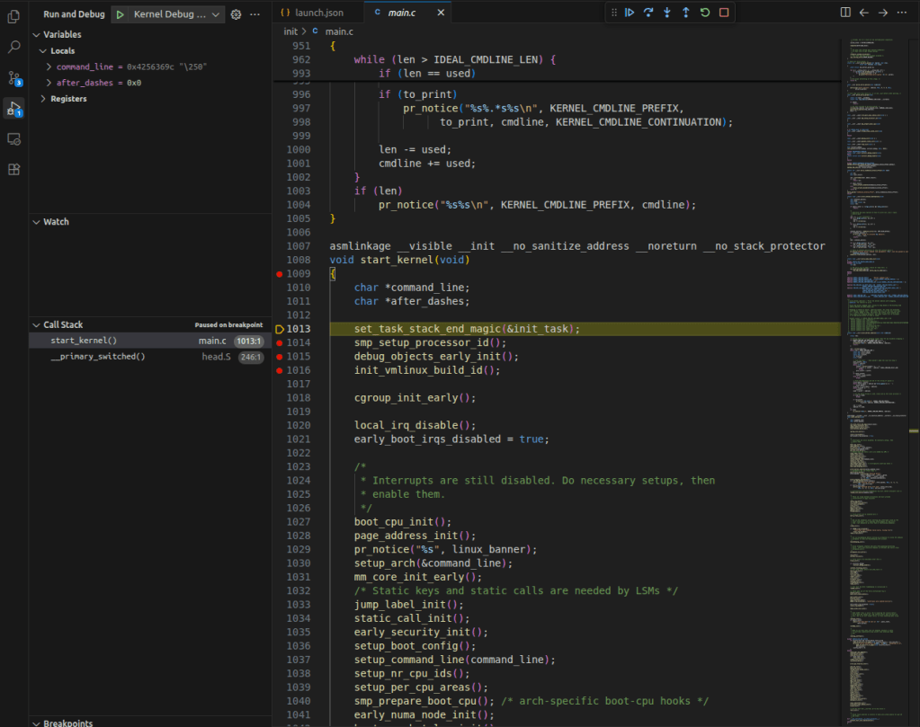 Giờ bạn vào init/main.c và đặt break point tại start_kernel ok rồi nhé