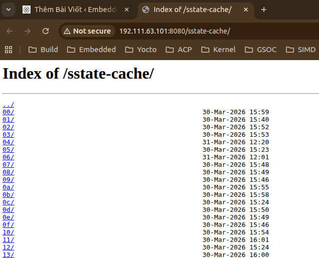 Ở đây mình dùng nginx, các bạn hoàn toàn có thể dùng các cách đơn giản hơn. Vì ở đây đơn giản là share cái folder sstate-cache, từ 1 máy khác đã build yocto sang 1 máy cùng mạng